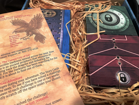 the story and instructions on how to move forward. This game follows a "rinse and repeat" function where you must solve the puzzle on the outside of the box, then a puzzle to open the orb, and another puzzle to move onto the next location. The answer cards offer four options and once you have the answer, you scratch out the spot under the word you believe is the answer. If you are correct, it will give you a number for which card you will need next to read. If you are incorrect there will be an "X".