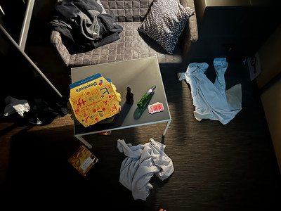 The set design for this room is exactly like the day after a crazy house party with messy clothing all over the place, empty pizza boxes and beer cans. But don't worry, the items are very sanitary. The atmosphere was quite different and interesting.