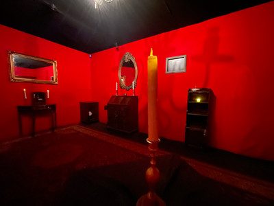 The red color walls with the dark furniture were a perfect match for a vampire room. It also created some great hiding spots for obvious clues.