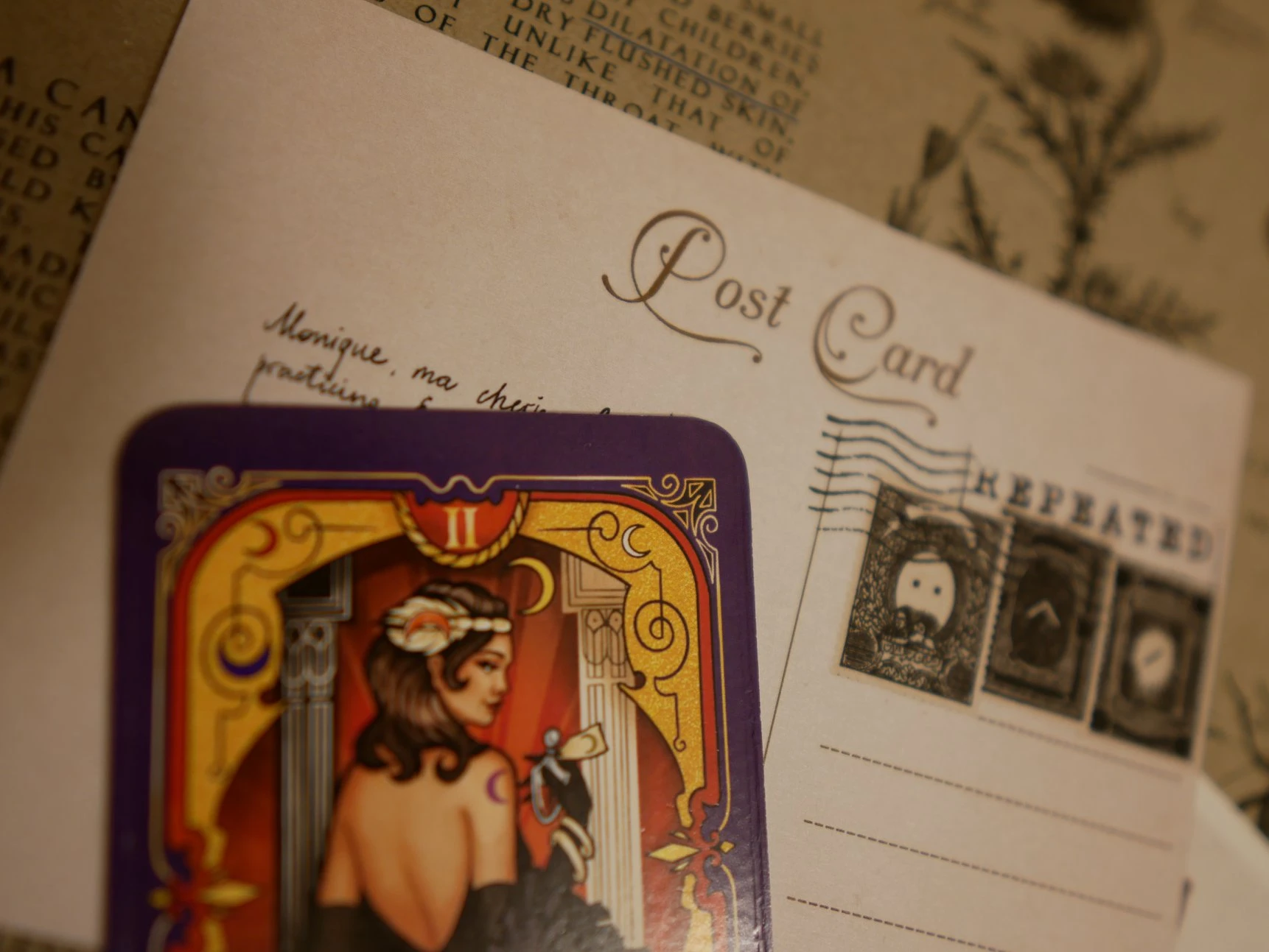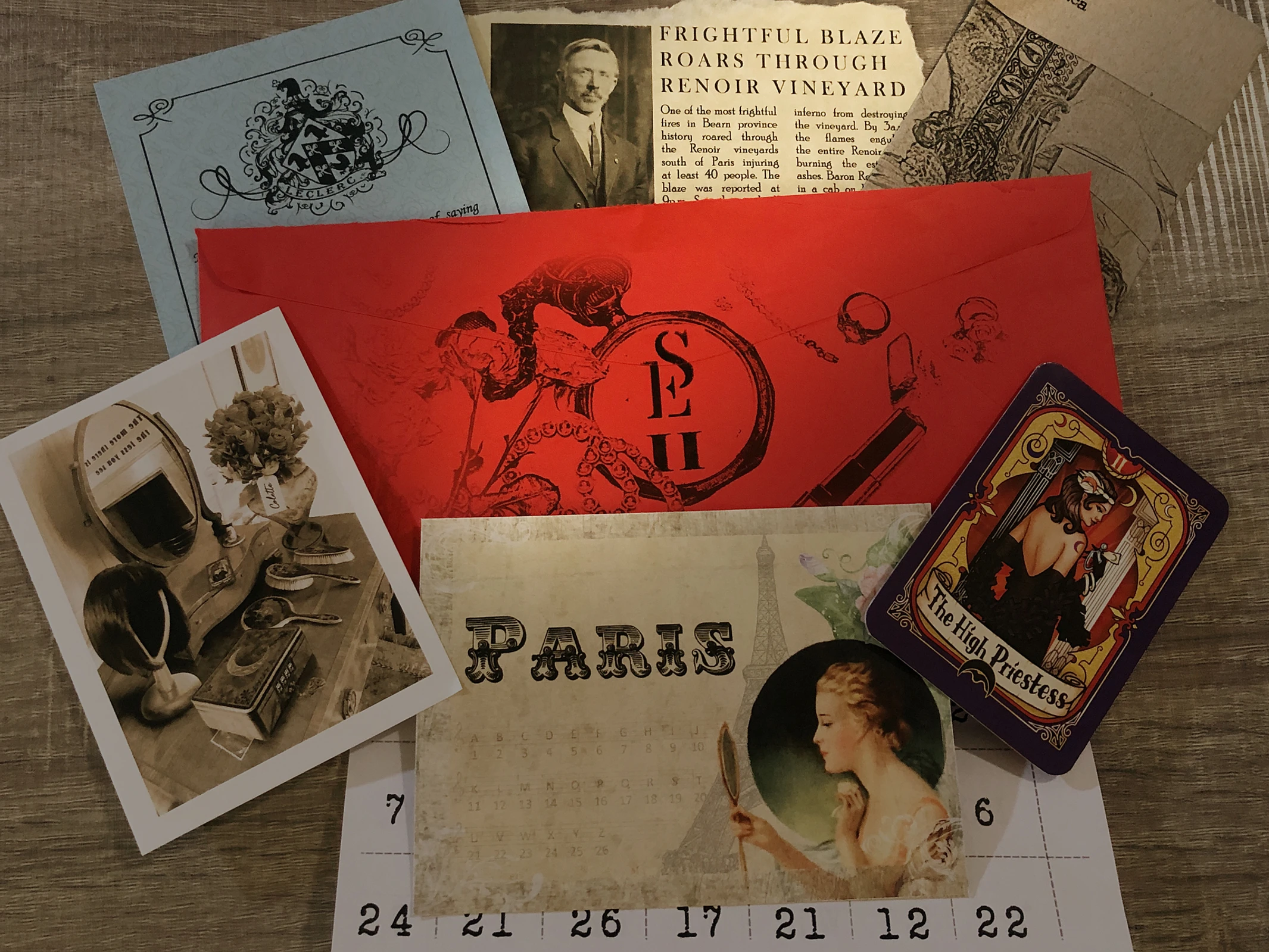 There were a lot of small pieces of reading materials in this envelope: a postcard, a newspaper clipping and a letter. Other items included a sheet of paper with letters and numbers, an encyclopedia page, a picture of Colette's dressing room (with QR codes) and a card. If you scan the QR codes, you'll receive an intro video on Youtube. If you prefer to play the game with some background music, there's a recommended soundtrack on Spotify.