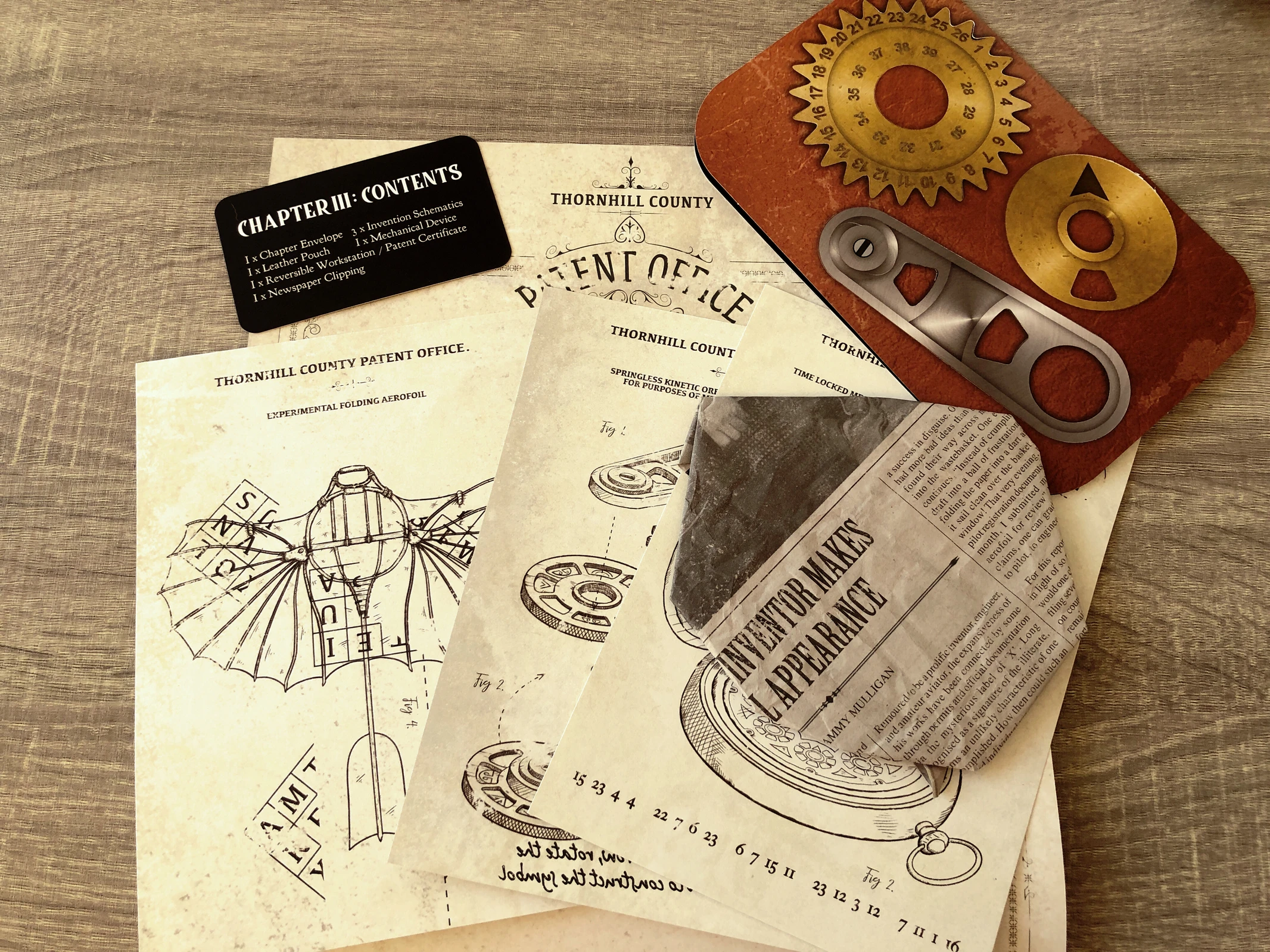 Similar to the previous games, the game components came in a pretty envelope with a sticker particular to this chapter. I did notice that they've improved on the glue that they've used from the previous envelopes as it's much easier to rip open how without getting the envelope destroyed. You'll want to be careful when opening up the envelope as the storyline is printed on the inside of it. The game components include: 1 leather pouch, 1 reversible workstation/patent certificate, 1 newspaper clipping, 3 invention schematics and 1 mechanical device.