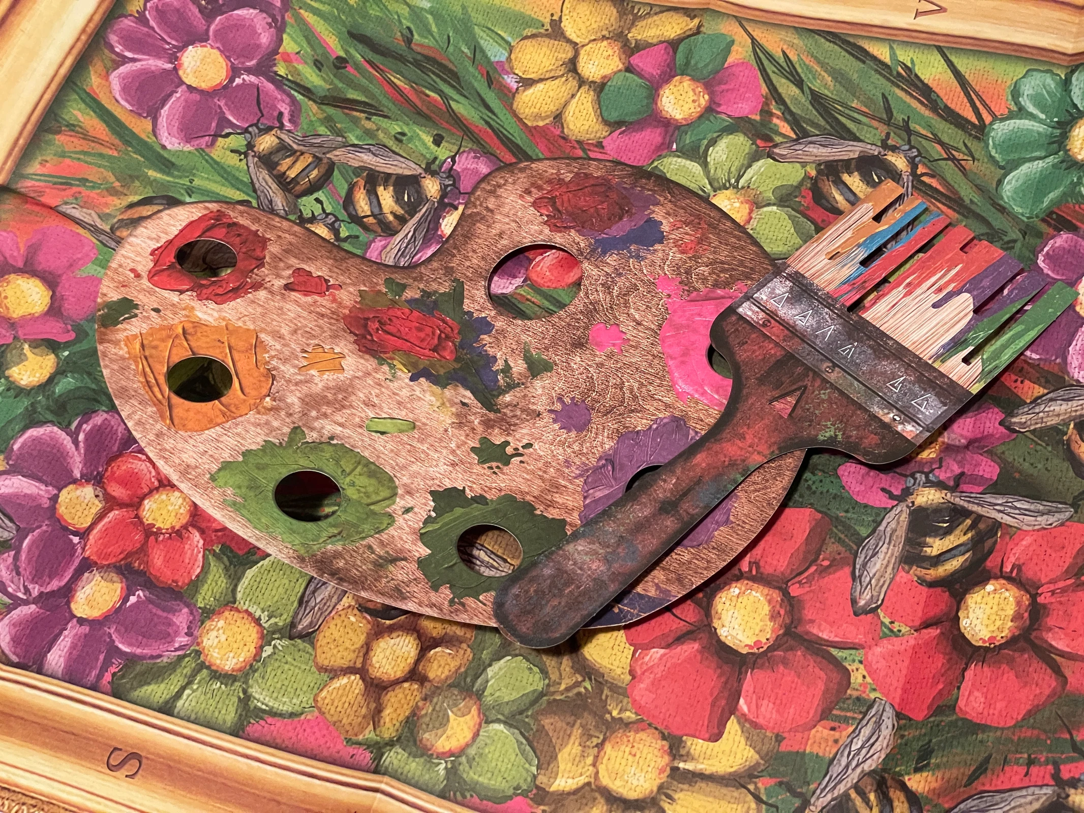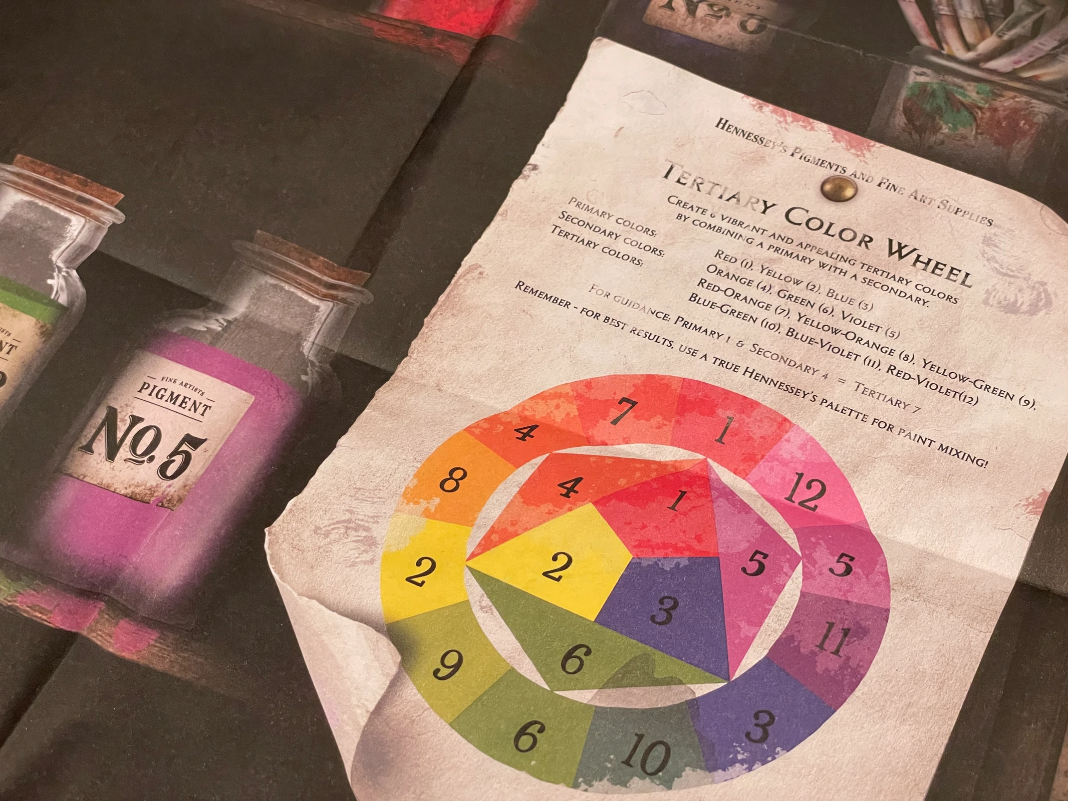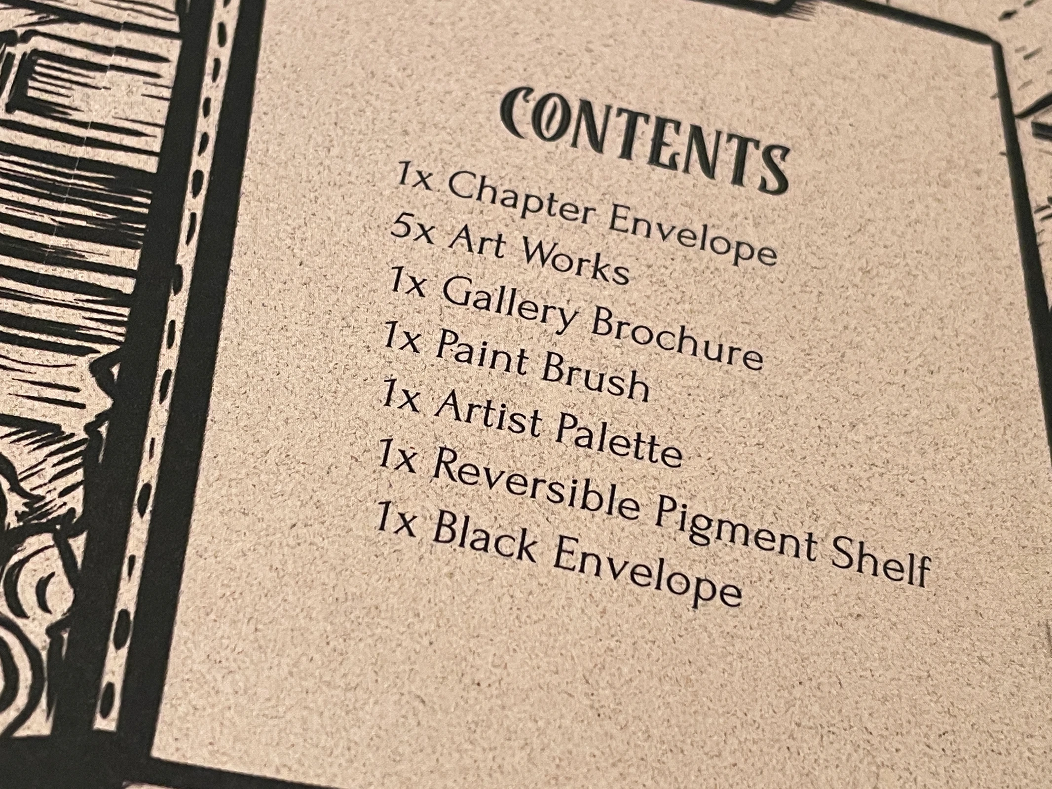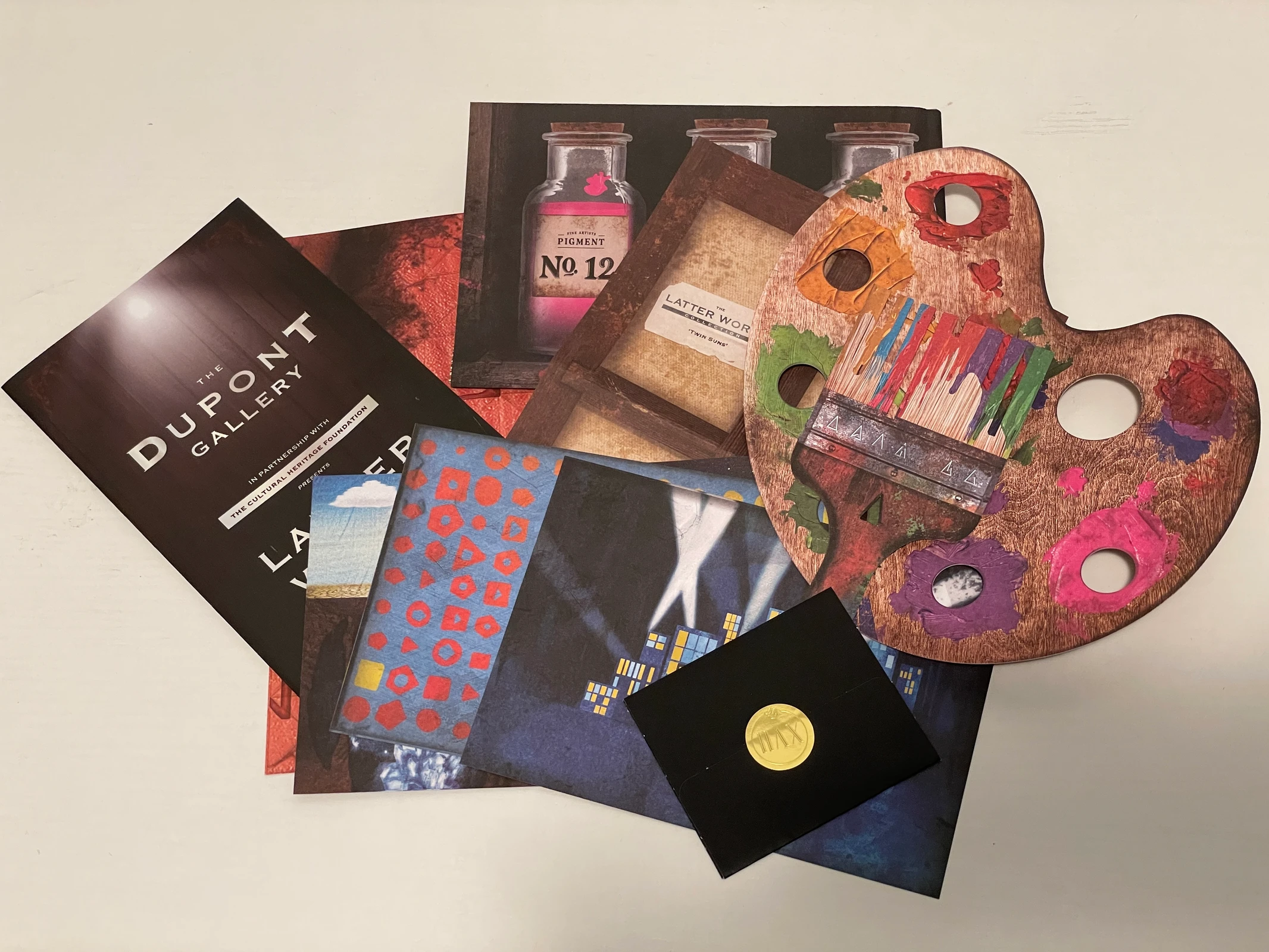 Unfolding the envelope that this game comes in, you are greeted with Curious Correspondence Club’s standard set up where the story is written on the envelope with a checklist of what should be included on the right and the QR code on the left for the hint page. In this particular game, the key items are (5) pieces of artwork, a gallery brochure, a paintbrush, artist palette and a pigment shelf.