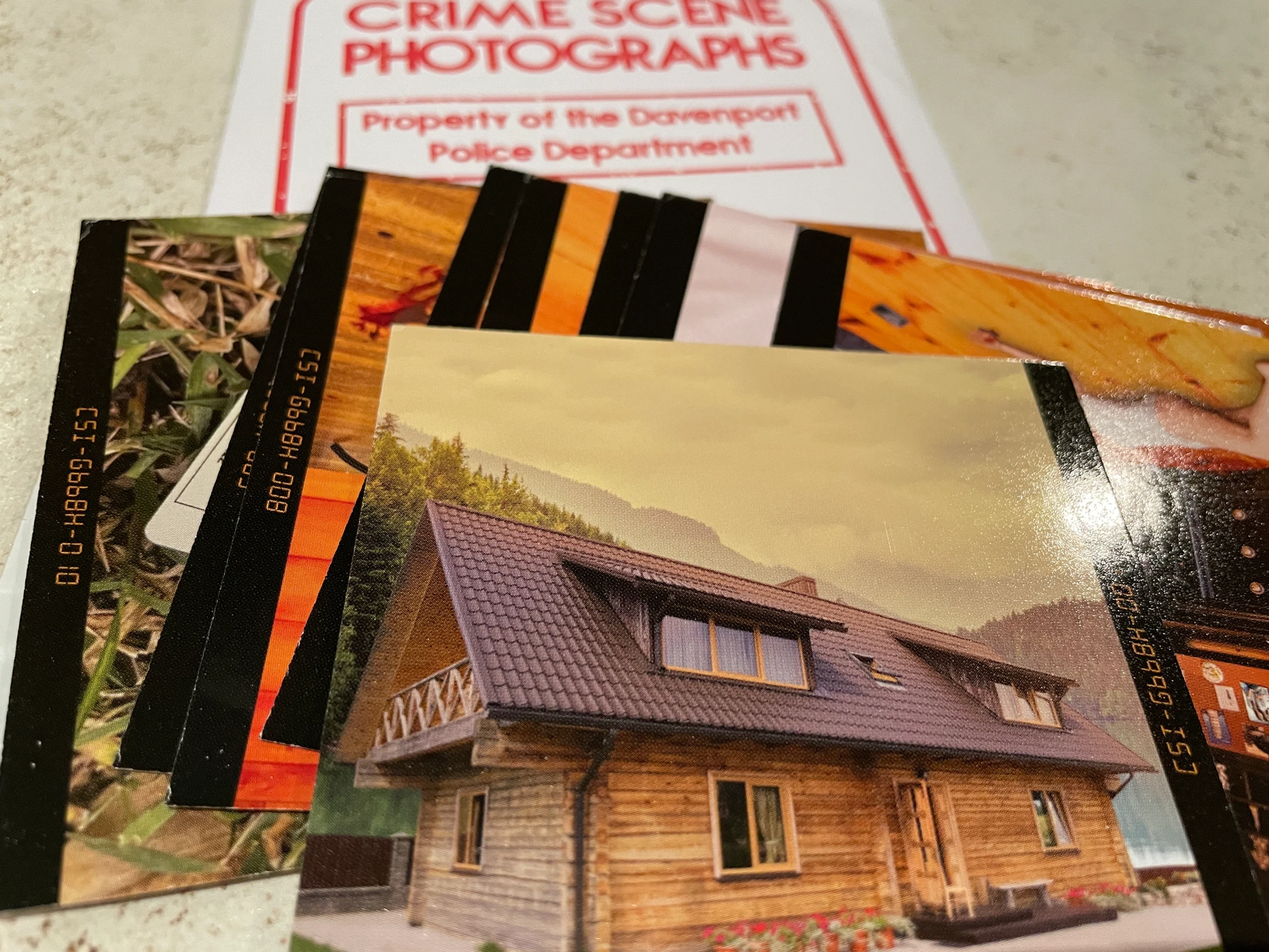 The packaging was smaller in size than the first game we played "Harmony Ashcroft". I'm not sure if it's just this game or if the company went through repackaging. It's lighter to carry around now as we actually bought the game on the trip with us. The game content was packaged in a plastic "evidence bag". Make sure to check the "inventory" list for any missing items. In this game, we received letters, photos, notepad, reports, business cards and three bonus envelopes.