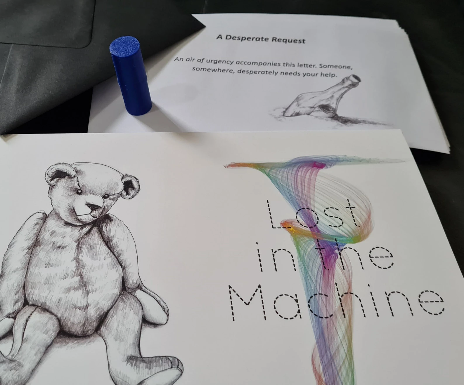 "Lost in the Machine" comes in a small box with a clean design sleeve displaying a teddy bear. Inside the box is an introduction letter to get your started, a small capsule, and 14 envelopes labelled with abstract messages that will only make sense when you know when to open them. Inside the envelopes are a range of letters and pamphlets from characters over the course of the experience. The main board for this game is an online text interface provided in the introduction letter.